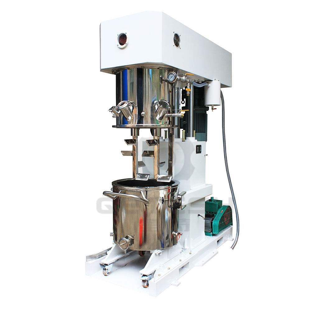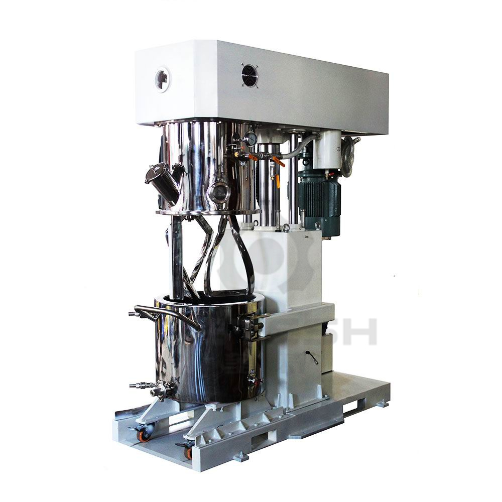 雙行星混合機的攪拌槳葉,在公轉(zhuǎn)的同時也自轉(zhuǎn),使罐體內(nèi)物料上下及四周循環(huán)運動,從而可在很短時間內(nèi)達到混合(混煉)效果。罐體內(nèi)壁為大型立車精加工,再經(jīng)大型拋光機自動拋光,確保行星箱上的活動刮刀在旋轉(zhuǎn)時,把罐體內(nèi)壁上的物料完全刮掉。該機特別適合從粉體到高黏度、高密度的物料溶解、混合、混煉、反應(yīng)工藝。廣泛應(yīng)用于電池、有機硅膠、油墨、染料、粘膠劑、高粘度涂料等化工產(chǎn)品。